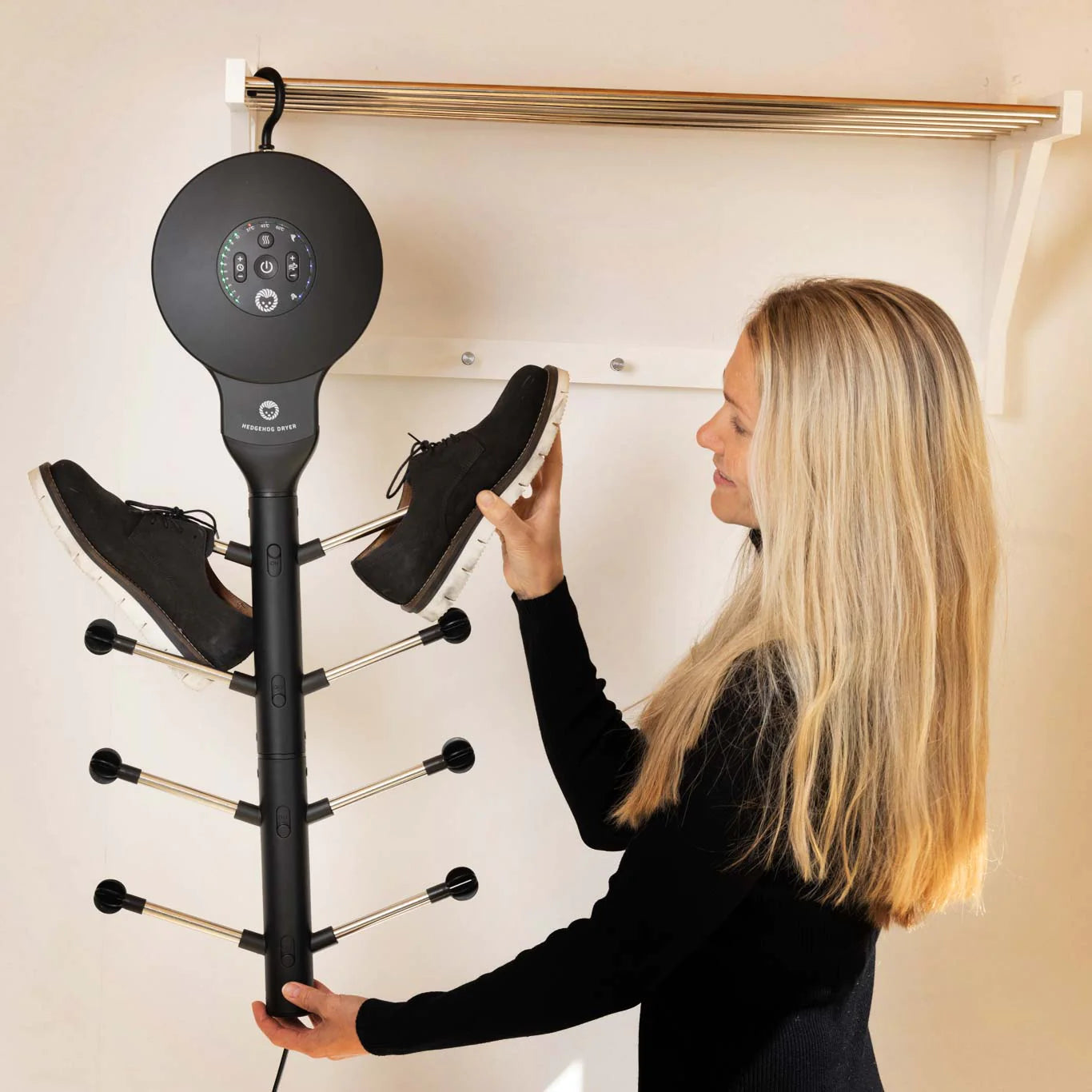 Yes, you can dry a pair of wet running shoes as fast as 5 minutes, but this requires that all the air goes into one pair shoes at maximum speed and heat. Allow a little common sense to prevail. Drying times depend on many things such as the material of the shoes, their size, how wet etc, so expect most items to dry within 15 to 20 minutes. For big boots or rain boots allow up to 40 minutes.